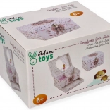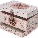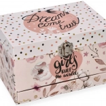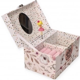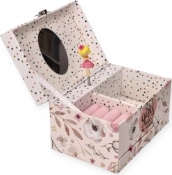 Ez a finom, rózsaszín ékszerdoboz virágos és pöttyös mintával mindent rejt, amit a kislányok szeretnek: a fedél felnyitásakor felcsendül a dallam, és a balerina forog a tengelyén az ovális tükör előtt. Belül praktikusan tagolt tér vár rekeszekkel és gyűrűtartó párnákkal az apró kincsekhez.