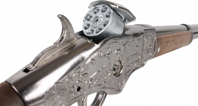 Fedezze fel a vadnyugat világát ezzel a cowboy puskával, amely autentikusságot és biztonságos szórakozást kínál gyermekeknek fém szerkezetének és 8 lövés kapacitásának köszönhetően.