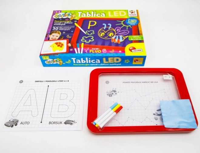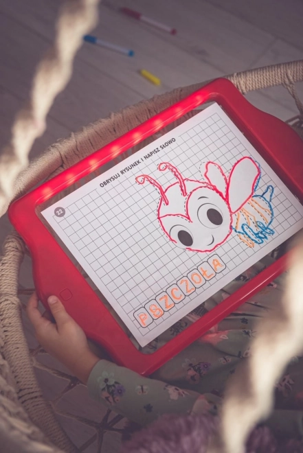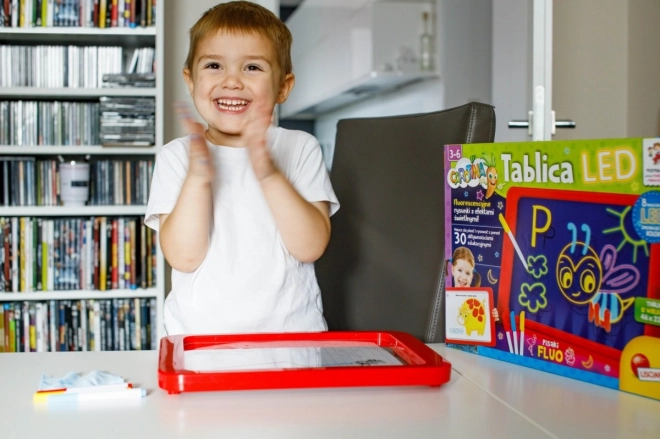 A Tabule LED Carotina ideális oktatási eszköz a gyerekek számára. 30 oktatókártyára épülő oktatóprogramot kínál, amelyet a programozott másolási módszer segítségével lehet használni. Csak helyezze a kártyát a papíralapra, és tegye a tábla átlátszó képernyője alá. A rajzolást három fluoreszcens marker segítségével végezheti, amelyek a készlet részét képezik. Ezekkel a markerekkel a gyerekek újra és újra rajzolhatnak, és száraz törlőkendővel eltávolíthatják a rajzokat. A LED tábla sokoldalú, mint egy klasszikus tábla, és szinte úgy világít, mint egy neonfelirat!