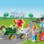 A Playmobil Mentő Akcióval drámai pillanatokat élhet át a gokartversenyen. A sofőr hirtelen elveszíti az uralmat a jármű felett, de orvos Mikey azonnal a helyszínen van, hogy segítséget nyújtson. Minden jól végződik, ami órákig tartó játékot biztosít a történettel.