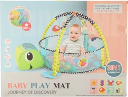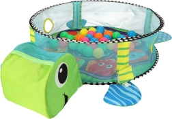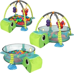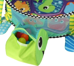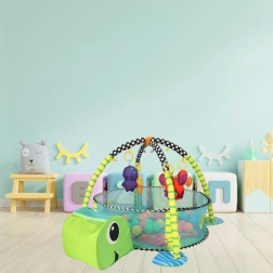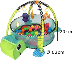 Oktató játszószőnyeg teknős karámrésszel és labdákkal egy színes, puha és multifunkcionális szőnyeg, amely újszülött kortól ideális a gyermekek számára. Magas minőségű anyagokból készült, biztosítja a gyermek biztonságát és fejlődését. Nem csupán játszószőnyeg, hanem labdamedence is, amely rengeteg örömöt és érzékszervi ingert nyújt.