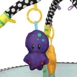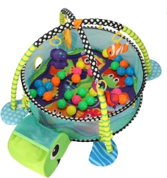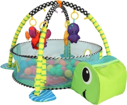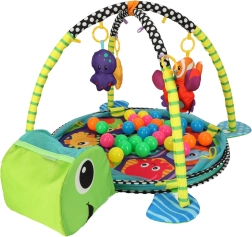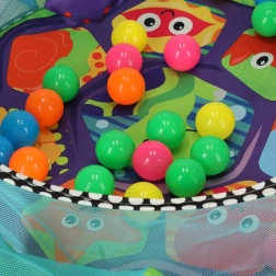 - Játékok és labdák: A szőnyeg színes és puha játékokat tartalmaz, mint például halacska, polip, csillag és tükörrel ellátott dobozka. Emellett 30 darab, élénk színű műanyag labda serkenti a gyermek érzékeit.