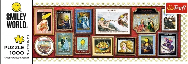 A vidám SMILEY Galéria motívumú panorámakirakó órákon át tartó, nyugodt szórakozást kínál felnőtteknek és nagyobb gyerekeknek egyaránt. A panorama formátum összeállítva szépen érvényesül a belső térben, és a minőségi nyomtatásnak köszönhetően minden részlet kiemelkedik.