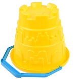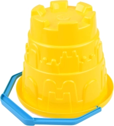 A kék fogantyús műanyag vödör és a benne lévő formák lehetővé teszik a könnyű szállítást a strandra vagy a kertbe.