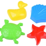 Négy műanyag forma kacsa, kagyló, teknős és csillag alakban, a dinamikus homok könnyű és szórakoztató formázásához.