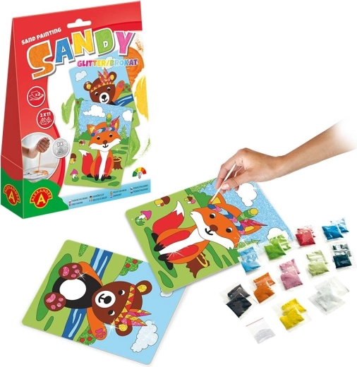 A róka és medve motívumú homokfestő készlet elbűvöli a kis művészeket, akik szívesen alkotnak ragyogó képeket. A gyerekek fokozatosan feltárják az öntapadó sablonok részeit, majd színes homokot vagy brokátot szórnak rájuk. Az eredmény egyedi, csillogó illusztrációk ragasztó vagy olló használata nélkül.