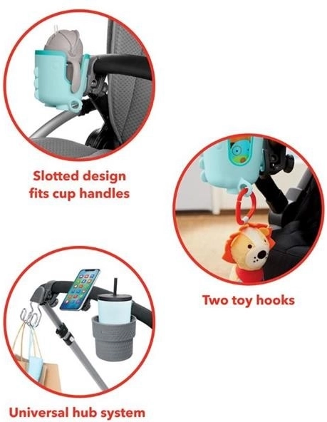 Tartsa kéznél a kávét, szívószálas palackot vagy a gyerek bögréjét a SKIP HOP univerzális pohártartójával. Okos kialakítása a füles bögrékre is illik, az univerzális rögzítő könnyen feltehető a legtöbb babakocsira, kerékpárra vagy bevásárlókocsira, a rugalmas betétek pedig biztonságosan tartják a különböző méretű edényeket. Emellett két játékakasztót is kínál az útközbeni szórakozáshoz.