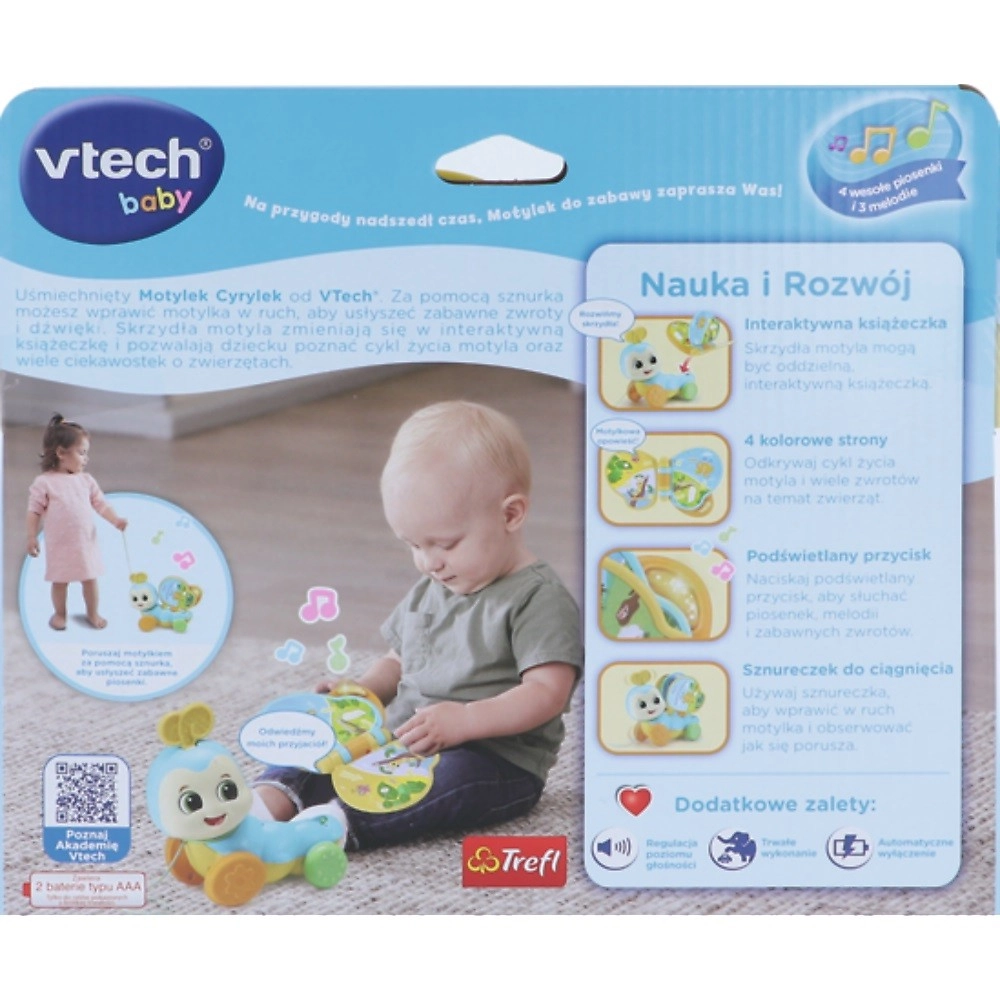 Az interaktív VTech pillangó mozgásra és felfedezésre ösztönzi a gyerekeket. Elég finoman meghúzni a zsinórt, a pillangó mozgásba lendül, és a kis felfedezőt hangokkal, dallamokkal és beszélt kifejezésekkel jutalmazza. Barátságos kialakításának és biztonságos anyagainak köszönhetően ideális a gyerekszobába és utazáshoz is.