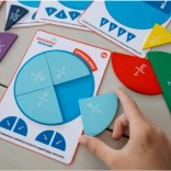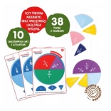 A készlet fa elemeket tartalmaz, amelyek az 1/2, 1/3, 1/4, 1/5, 1/6, 1/8, 1/10 törteket szemléltetik, valamint hozzájuk illő feladatkártyákkal egészül ki.