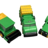 A készlet tartalmaz traktor-, kombájn- és teherjármű-modelleket levehető részekkel. A masszív műanyag ellenáll a mindennapi játéknak, míg a valósághű részletek és az olyan feliratok, mint a „Popular Farms”, támogatják a farmtémájú történetmesélést.