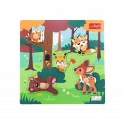 Fedezze fel a minőségi, fából készült kirakót erdei állatok motívummal a legkisebbeknek. 5 kivehető darabot tartalmaz fa gombbal, valamint egy alaplapot jelölt formákkal az egyszerűbb összeillesztéshez. Ez a játék támogatja a finommotorika fejlesztését, a formák megismerését és a kéz–szem koordinációt. Ideális választás 18 hónapos kortól.