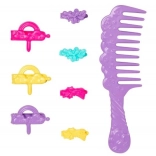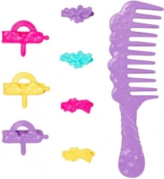 Színes csatok, hajtűk és egy széles fésű megkönnyítik a kifésülést és az új frizurák biztos rögzítését húzás nélkül.