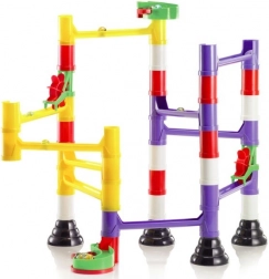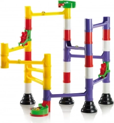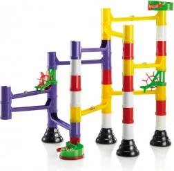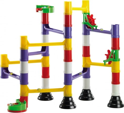 A moduláris csövek, oszlopok és sínek pontosan illeszkednek egymáshoz. A gyerekek gyorsan megértik az építés logikáját, és folyamatosan változtathatják a golyók útvonalát.