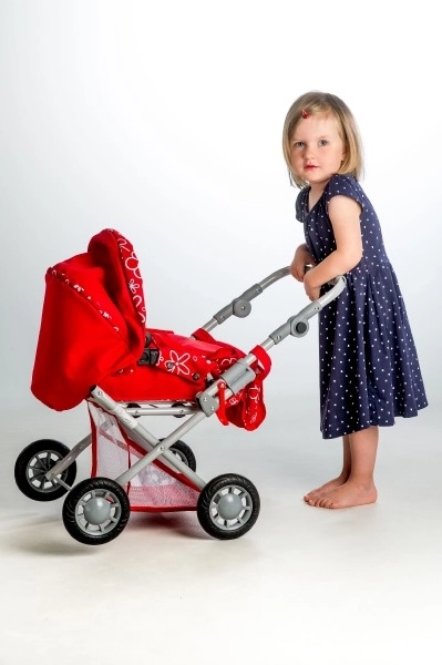 Átgondolt részletek, mint a bevásárlókosár a bölcső alatt és a pelenkázó/kelengye táska, amely a tolókarra akasztható, megkönnyítik a mindennapi játékot. A 30–60 cm között állítható tolókar együtt nő a gyermekkel, és ergonomikus fogást biztosít. A 15 cm átmérőjű kerekek simán gördülnek, így egyenletes haladást adnak a lakásban és a szabadban is.