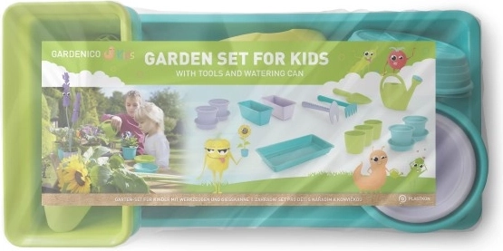 Kerti készlet gyerekeknek szerszámokkal és locsolókannával, műanyag, fóliában 40×20×11 cm