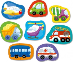 - 8 önálló mini puzzle közlekedési eszközök körvonalaival