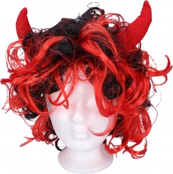 Stílusos farsangi paróka piros szarvakkal és feltűnő piros hajjal, amelyben fekete tincsek is átlátszanak. Ideális gyerek- és felnőtt ördögjelmezekhez. Feltűnő megjelenés, könnyű felvétel és szuper kiegészítő Mikulásra, farsangra és bulikra. 6 éves kortól ajánlott.