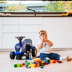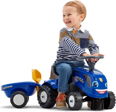 A NEW HOLLAND kis traktor 12 hónapos kortól ösztönzi a képzeletet és a mozgást. A könnyű és tartós műanyag szerkezetnek köszönhetően könnyen kezelhető, biztonságos és stabil az első vezetési élményekhez. A levehető utánfutóval játékokat, kockákat és kerti kincseket is lehet szállítani.