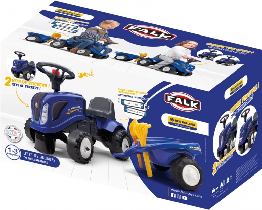 A Falk márkájú, kék NEW HOLLAND lábbal hajtós traktor remek választás a kis farmerek első utazásaihoz. Levehető utánfutót, kormányt dudával, stabil szerkezetet és minőségi műanyag kerekeket kínál. Tartozékok: homokozójátékok – lapát és gereblye, valamint két matricaszett, köztük vidám „mosolygós” változat a személyre szabáshoz.
