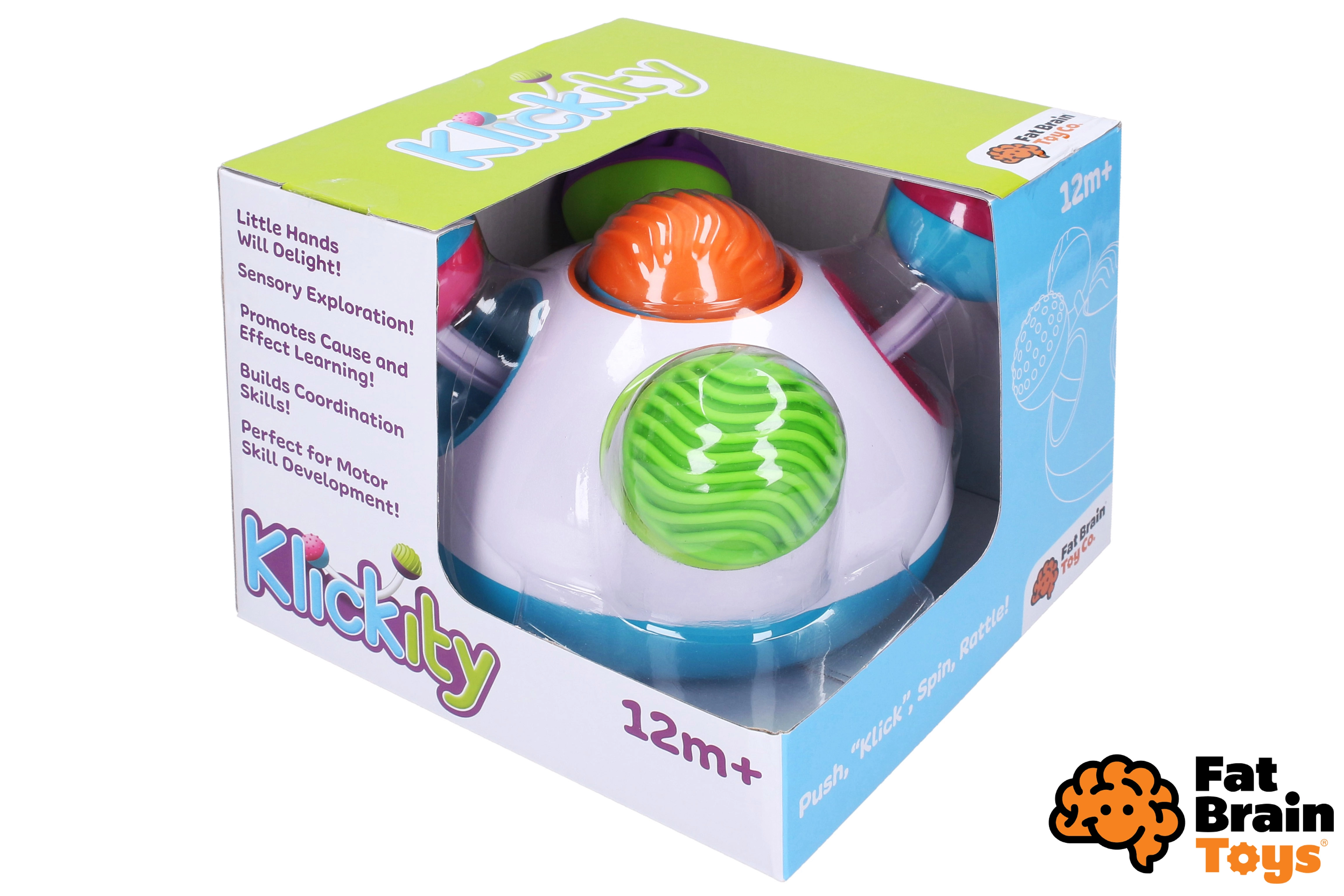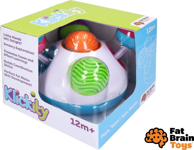 A Fat Brain Klickity okos motoros játék, amely ösztönzi a gyerekek természetes kíváncsiságát. A kontrasztos színek, a kellemes textúrák és az egyszerű mechanikus funkciók (nyomás, kitolás, forgatás) hosszú percekig tartó, elmélyült játékot és készségfejlesztést kínálnak.