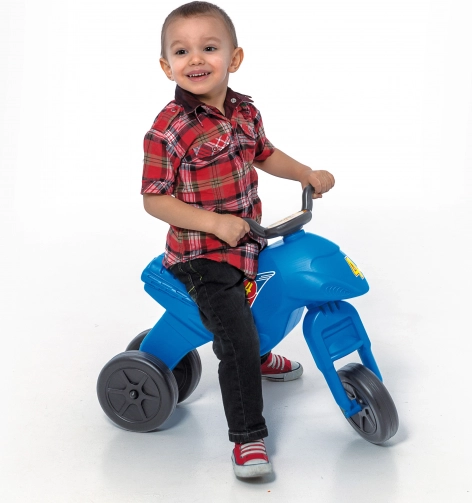 Könnyű és stabil háromkerekű futóbicikli kék színben az első biztonságos gurulásokhoz. Kínál stabil szerkezetet, praktikus 60 × 28 × 48 cm méretet és 50 kg teherbírást. Mutasson többet