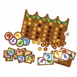 A doboz tartalma: kétoldalas játéktábla, 60 dinoszauruszkártya, kezdőkártyák, zsetonok az alap- és haladó változathoz, láva zsetonok, finomság zseton és áttekinthető szabályok.
