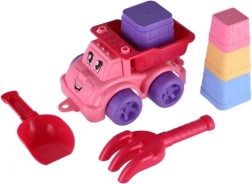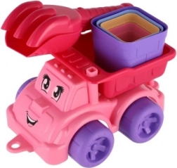 Színes műanyag autó vidám arckifejezéssel, ami tökéletes a homok szállításához és a gyermekek képzeletének fejlesztéséhez.