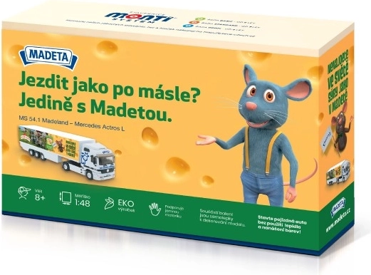 Monti System Madeland Mercedes Actros L építőjáték lenyűgöző építőjáték, amelyet ragasztó és festék nélkül összeállíthat a 1:48 méretarányban. Az ügyes mechanizmusok révén az összetevők egyszerűen becsatolhatók egymásba.