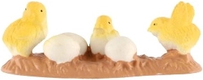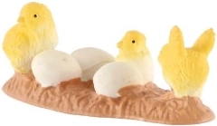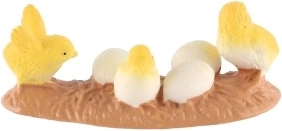 A dekoráció három sárga csibét és néhány fehér tojást tartalmaz barna talapzaton, ami vidám légkört ad az otthonának.