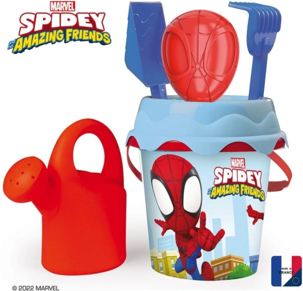 Gyerek strand szett SPIDEY mintával: 17 cm-es vödör, gereblye, lapát, homokforma és locsolókanna. A IML technológiának köszönhetően a minta kopásálló, és sokáig újszerű marad. Franciaországban készült.