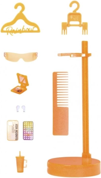 A babához számos stílusos kiegészítő tartozik, beleértve a fésűt, napszemüveget, vállfát, sminkpalettát és italtartót, amely nagyszerű hely a stylinghoz és játékhoz.
