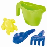 A 33 cm hosszú teherautó tartalmaz egy kannát, gereblyét, lapátot és formát homokhoz, ideális szabadtéri gyerekjátékokhoz.