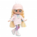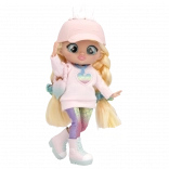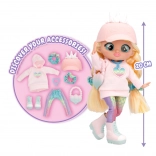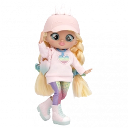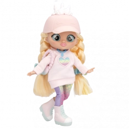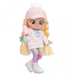 A csuklók lehetővé teszik, hogy a baba különféle pózokba álljon. A kristályhatású szemek és a színes haj valósághű, stílusos megjelenést adnak.