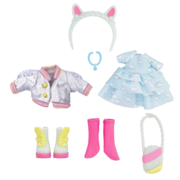Fordítsd el a tubust, és fedezz fel több mint 9 kiegészítőt: ruhát, ezüst kabátkát, cipőt zoknival, táskát és fejpántot/sapkát – mind tökéletesen összehangolva.