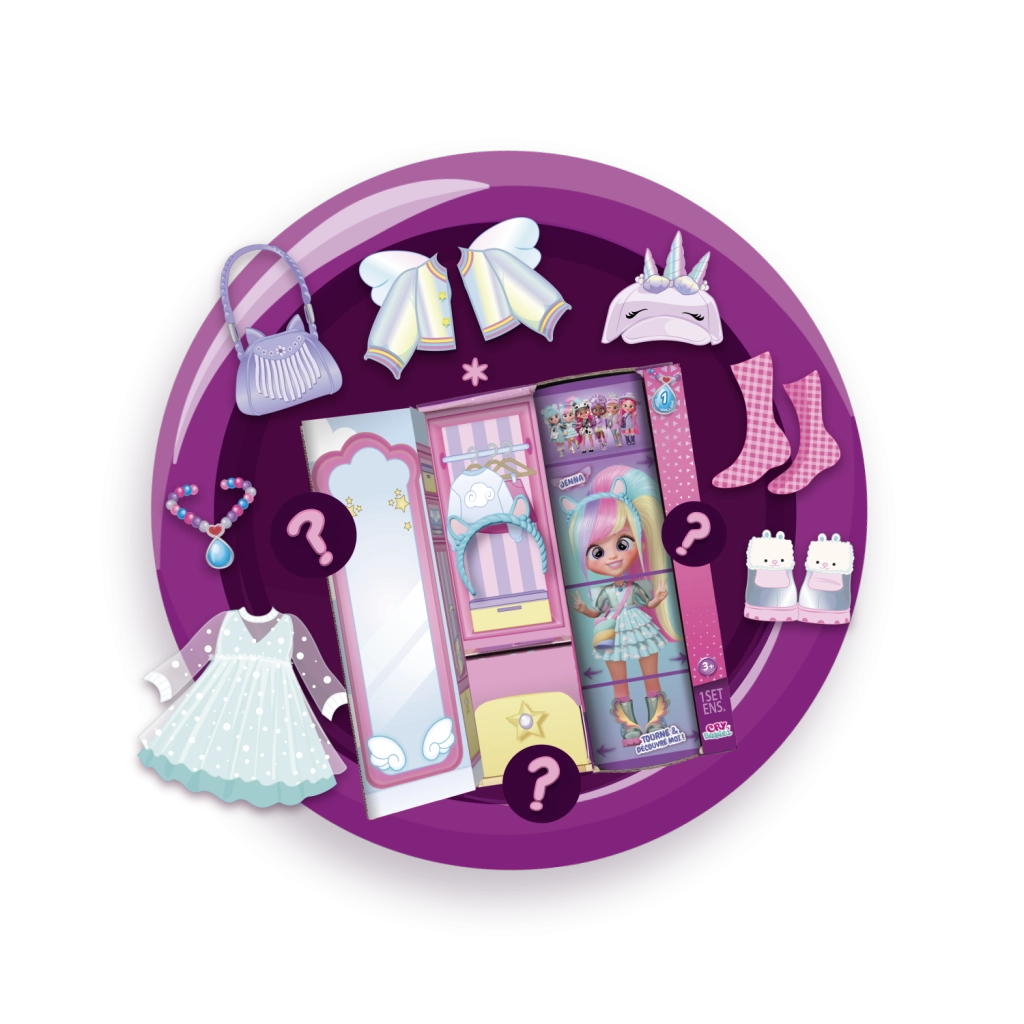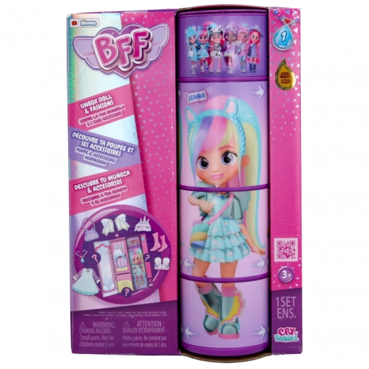 Minden BFF egy különleges tubusos csomagolásban rejtőzik, amely gardróbbá alakul. Forgasd el a tubus részeit, és fedezd fel a pózokat és a titkos rekeszeket a kiegészítőkkel. A szettben több mint 9 kiegészítő vár: 2 ruhadarab, táska, fejpánt/sapka, cipő stílusos zoknival és BFF nyaklánc – mind a fantáziadús „unikornis” stílusban összehangolva.