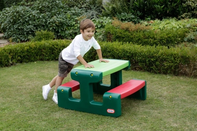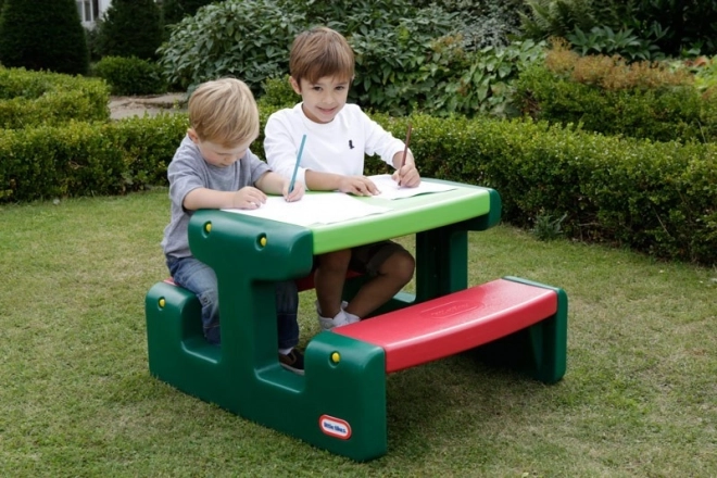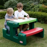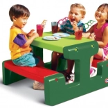 Praktikus gyerek piknikasztal LITTLE TIKES zöld és piros színkombinációban, amely stabil felületet kínál játékhoz és étkezéshez, valamint kényelmes, integrált padokat. Időjárásálló, könnyen tisztítható, és a lekerekített éleknek köszönhetően biztonságos a gyerekek számára. Az asztalnál egyszerre akár négy gyerek is kényelmesen játszhat vagy uzsonnázhat.