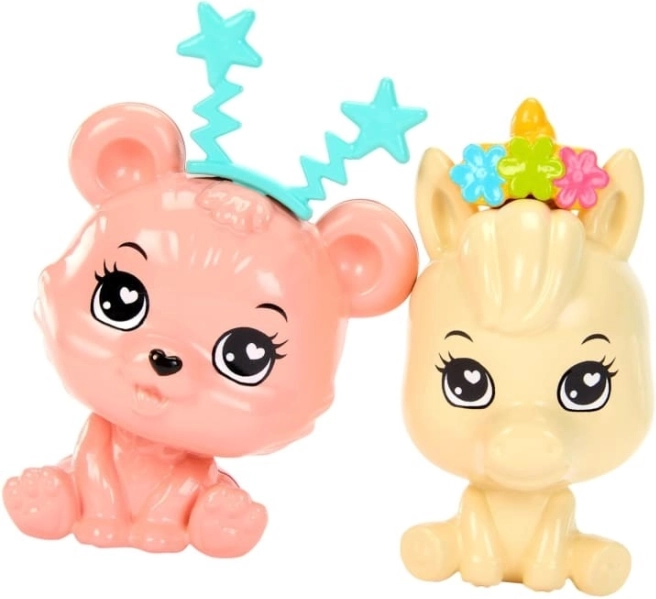 Két állatfigura – rózsaszín medve és bézs ló – kiegészítik a születésnapi ünnep hangulatát.