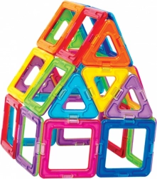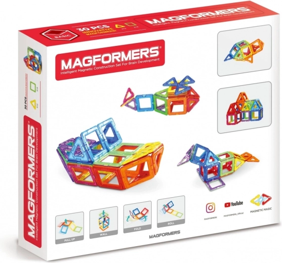 A Magformers Basic 30 készlet erős neodímium mágnesekkel ellátott elemekből áll, amelyek mindig vonzzák egymást. Elég, ha két elemet az oldalaikkal egymáshoz közelítünk, és azonnal összekapcsolódnak. A geometriai formák szerint kialakított elemeknek köszönhetően gyönyörű, háromdimenziós építményeket készíthet. A játékhoz használhatja a mellékelt útmutatót, a magformersworld.com oldalon található további példákat, vagy a saját fantáziáját. A készlet tartalma: 12 háromszög; 18 négyzet.
