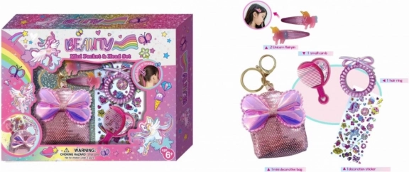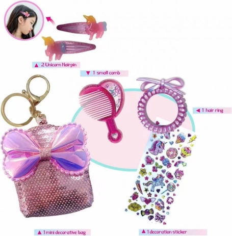 - Flitteres, masnis táska (kulcstartóként is használható), 2 unikornisos csat, fésű, spirál hajgumi, matricalap
