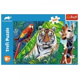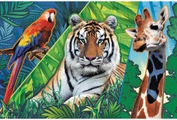 Színes állat-kollázs tigrissel, papagájjal és zsiráffal, amely motivál az összerakásra, és elkészült állapotban remek dekorációként mutat.