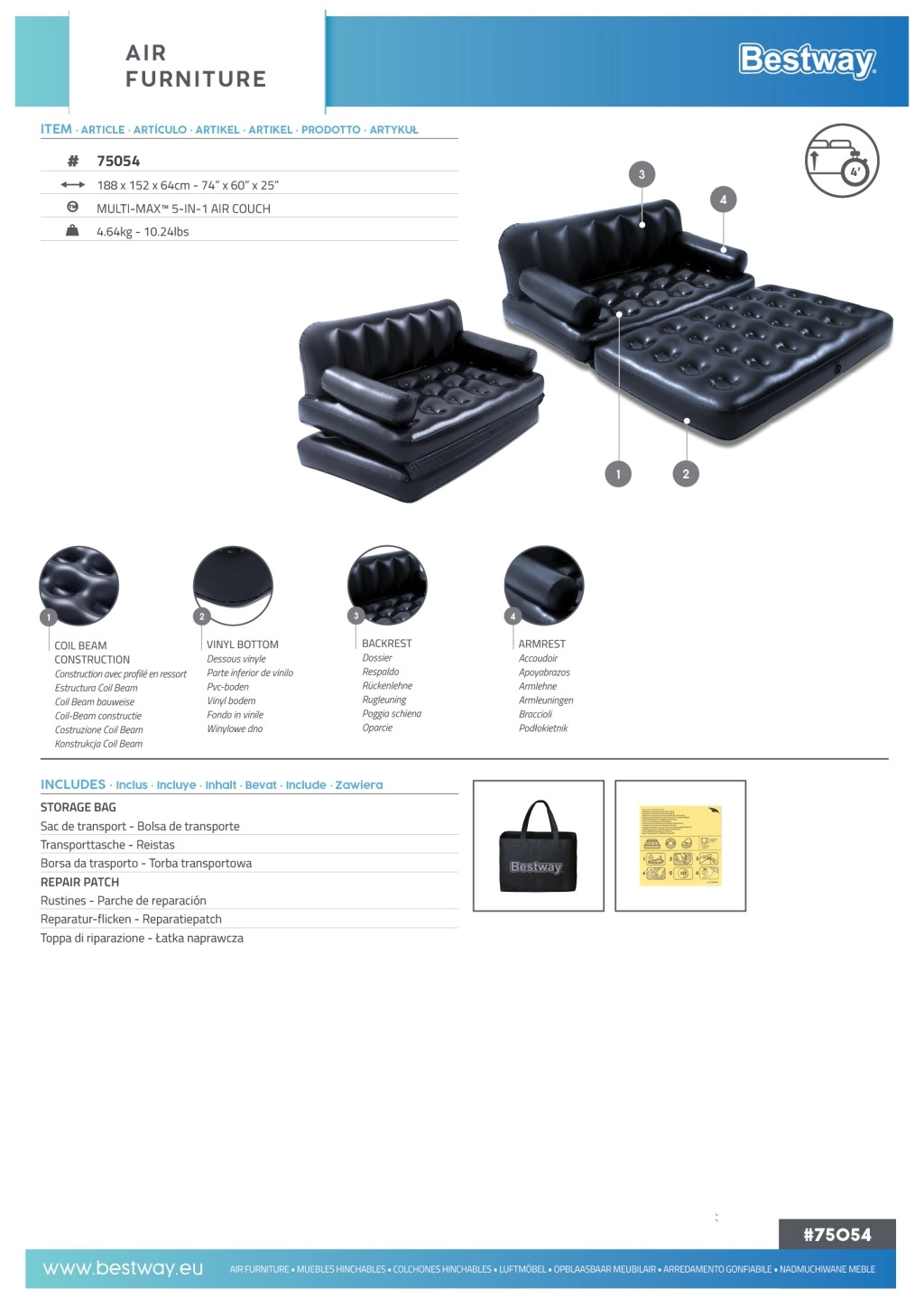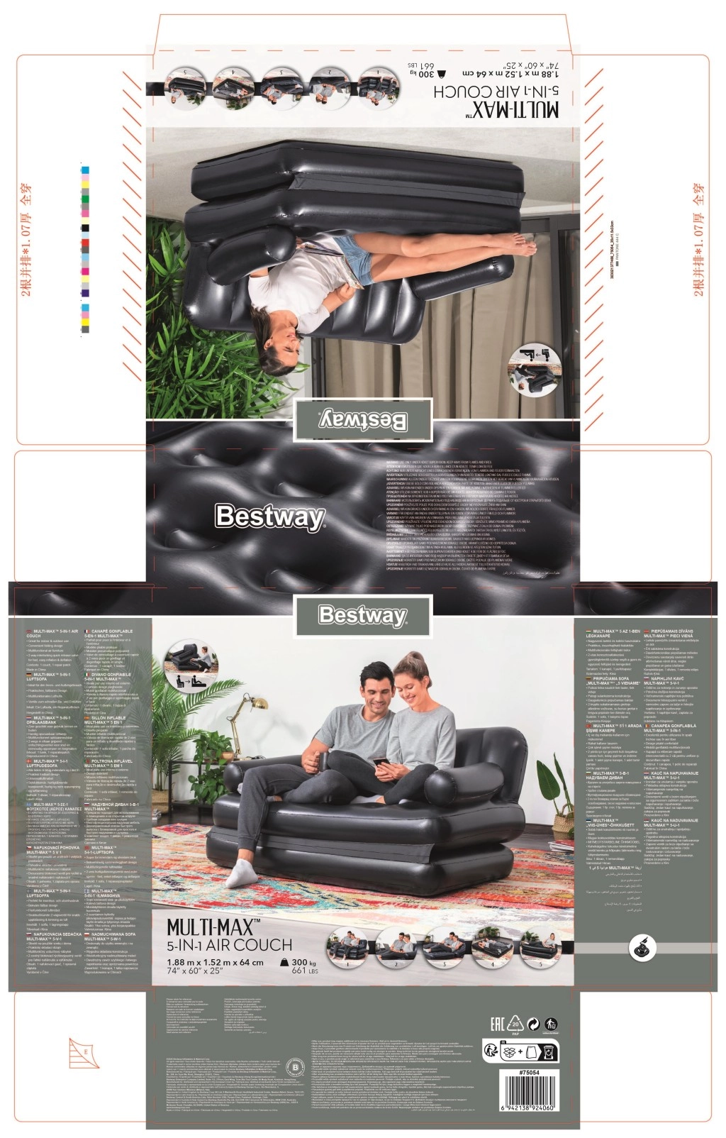 A BESTWAY 5 az 1-ben univerzális felfújható kanapé kényelmes ülést és kétszemélyes alvóhelyet egyesít. Kanapéként, nyugágyként és franciaágynak is használható dupla réteggel. Tartós PVC, stabil Coil Beam szerkezet és gyorsleeresztő szelep biztosítja a könnyű használatot, a kényelmet és a hosszú élettartamot beltéri környezetben.