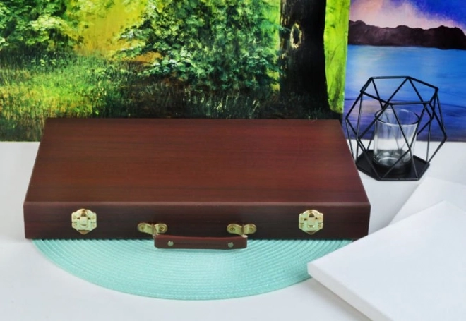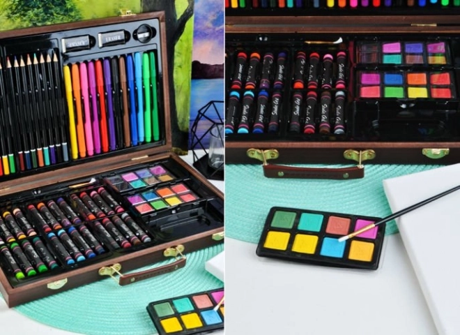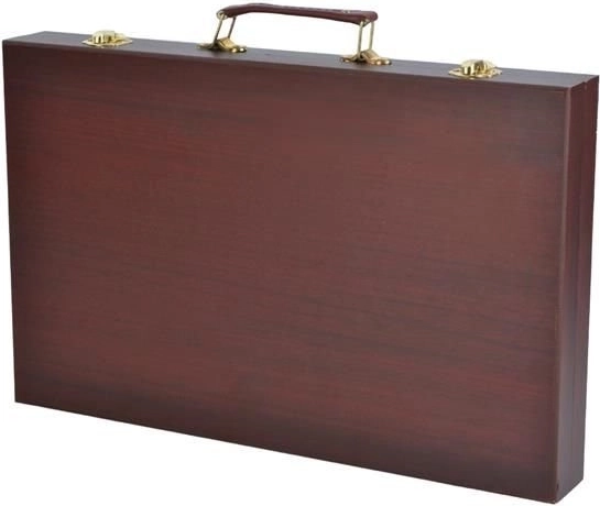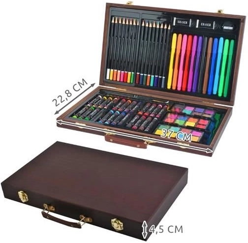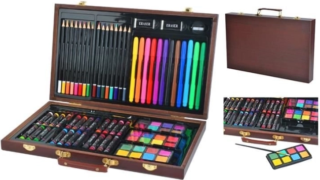 Minden rajz- és festőeszköz rendezett, kihajtható, rekeszekkel ellátott fa kofferben kapott helyet, így mindenhez gyorsan és könnyen hozzáférhet.