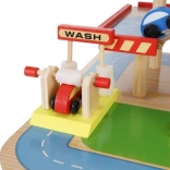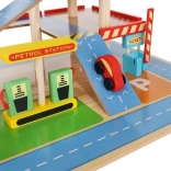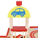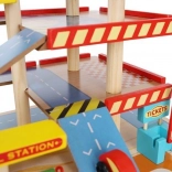 Fedezze fel a masszív, fából készült parkolót garázzsal, amely három játékszintet kínál rámpákkal összekötve, működő liftet és felső heliportot. A gyerekek élvezhetik a valósághű elemeket, mint az autómosó, a benzinkút és a jegyárusítás, amelyek élethű közlekedési jeleneteket teremtenek.