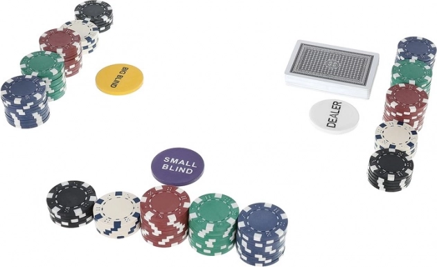 A csomag része továbbá a funkcionális szerepzseton készlet (DEALER, SMALL BLIND, BIG BLIND) az átlátható szervezéshez, 2× 54 lapos kártyapakli a folyamatos rotációhoz és 5 dobókocka a további asztali szórakozáshoz. A szett ideális otthoni játéktermekhez, bulikhoz és baráti megmérettetésekhez.