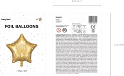 Stílusos, csillag alakú fólia lufi elegáns arany színben, fehér Happy Birthday felirattal. Tökéletes születésnapi bulira, héliummal vagy levegővel is felfújható, és remekül kiegészíti a dekorációt fényes felületének és a felfújva 40 cm-es kompakt méretének köszönhetően.