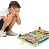 A tábla egyik oldala felfedező és tapintási elemekkel van ellátva, míg a másik krétarajztáblaként szolgál.