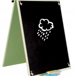 A tábla másik oldala krétarajztáblával van ellátva. A csomag tartalmaz krétát és szivacsot is. A tábla kiváló minőségű fából készült, ami környezetbarát alternatívát jelent a műanyag játékokkal szemben, és nagyobb tartósságot kínál.