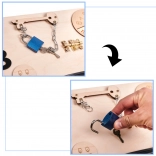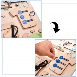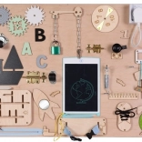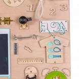 A tábla különféle interaktív elemeket tartalmaz, mint kapcsolók, cipzárak és más apróságok, amikkel a gyerekek biztonságosan játszhatnak tanulás és szórakozás céljából.