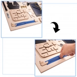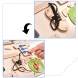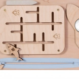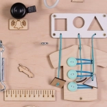 Fa manipulációs tábla szórakozást és fejlesztést kínál a gyermekeknek az interaktív elemek széles skálájának köszönhetően. A táblával való játék segíti a finommotorikát, a kéz-szem koordinációt és megtanítja őket az ok-okozati gondolkodásra. A termék biztonságot nyújt, köszönhetően a simára csiszolt fának.