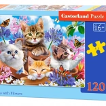 Színes gyerek puzzle aranyos kiscicák és virágok motívummal, amely örömet szerez a kis kirakórajongóknak. 120 darabot tartalmaz, és kirakás után 32 × 23 cm-es képet alkot. A darabok kellemes, esztétikus színekkel és minőségi kivitelezéssel készülnek, ami támogatja a koncentrációt, a képzelet fejlődését és a türelmet.